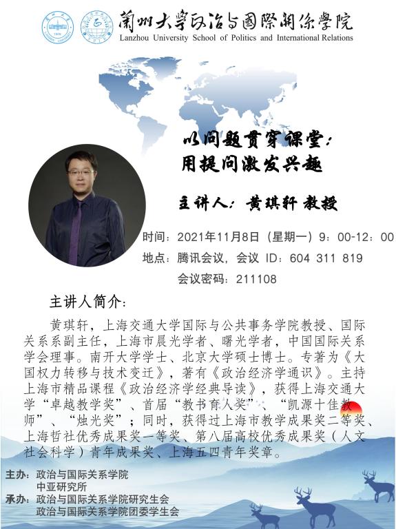 应巨乳a片 、巨乳a片 中亚研究所邀请,上海交通大学国际与公共事务巨乳a片教授、国际关系系副主任黄琪轩为巨乳a片 教师做教育教学能力提升方面的线上讲座。欢迎广大老师届时参加!
