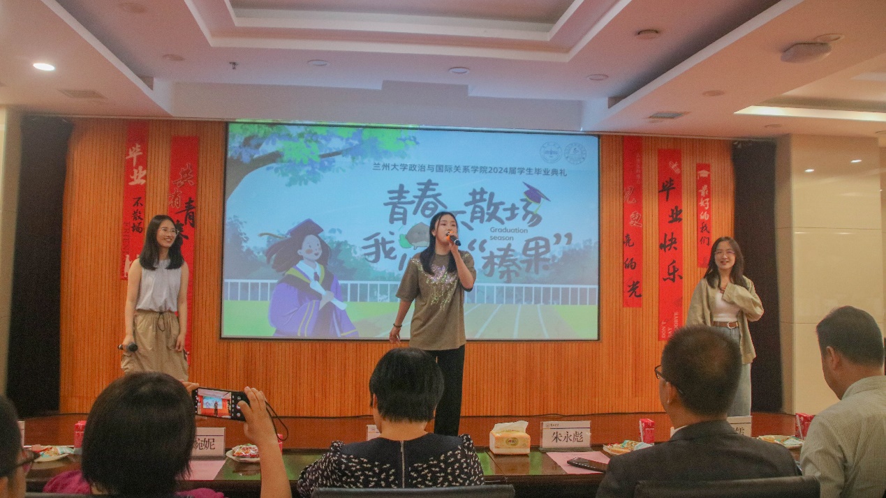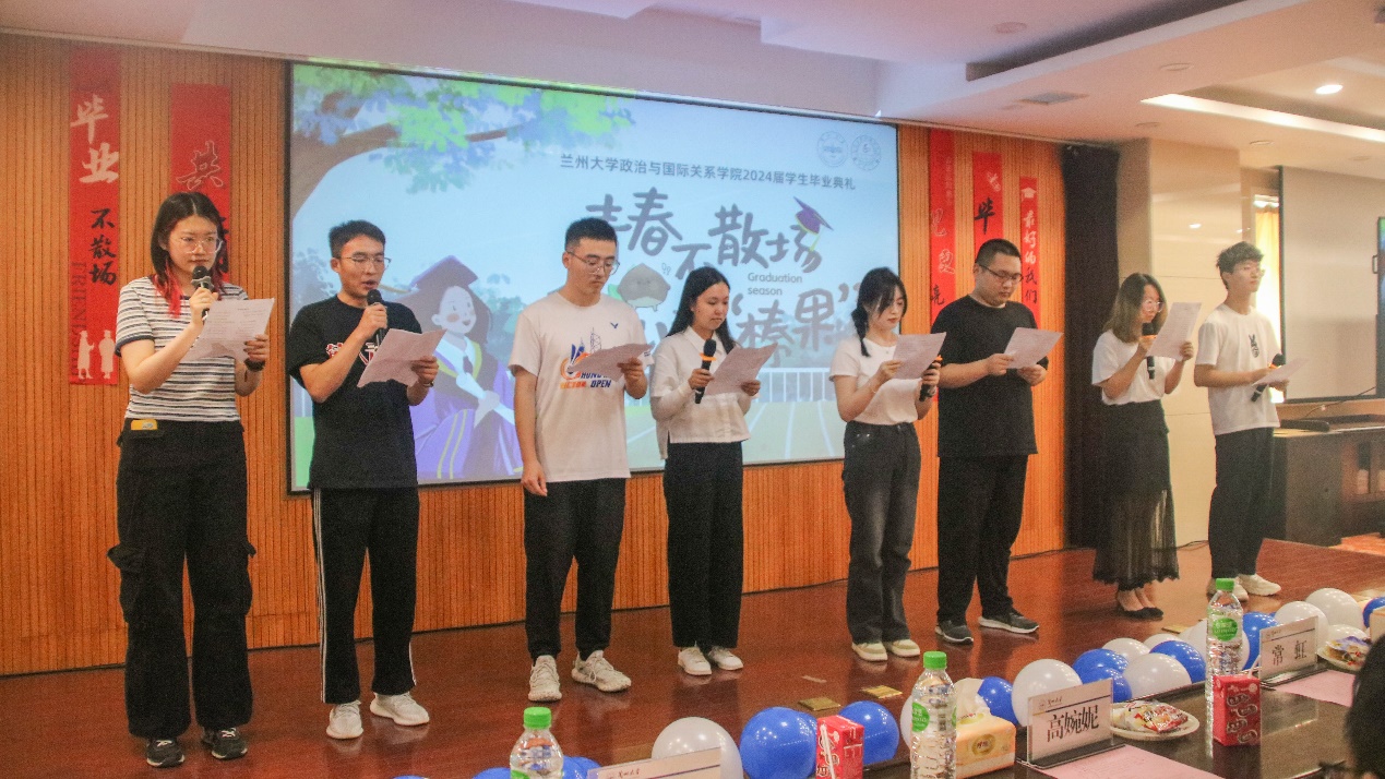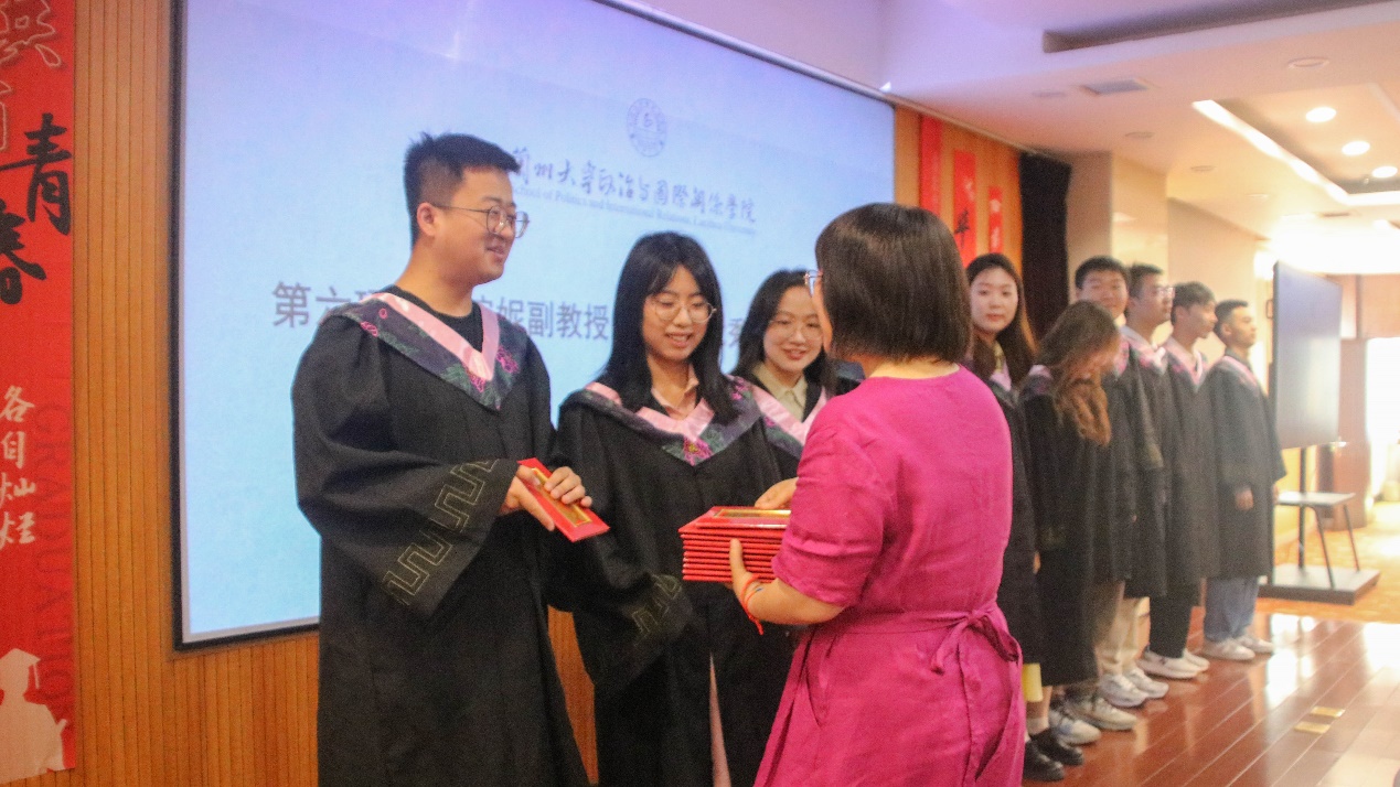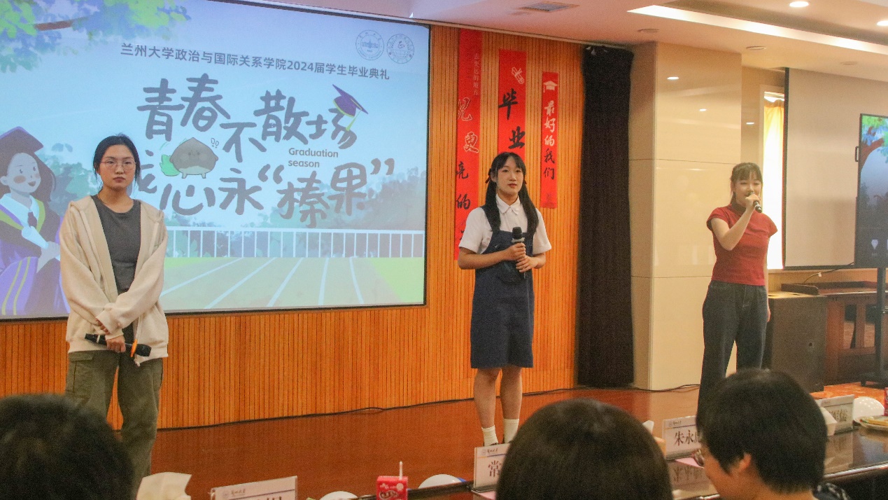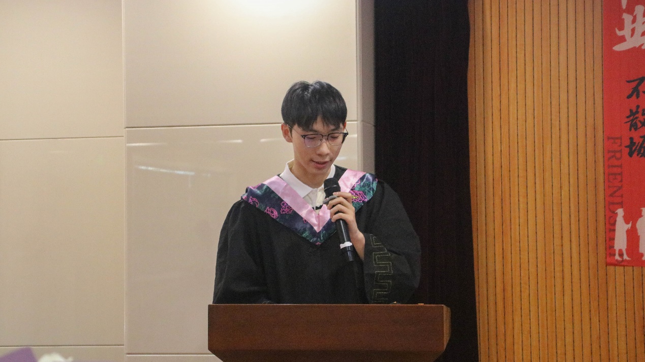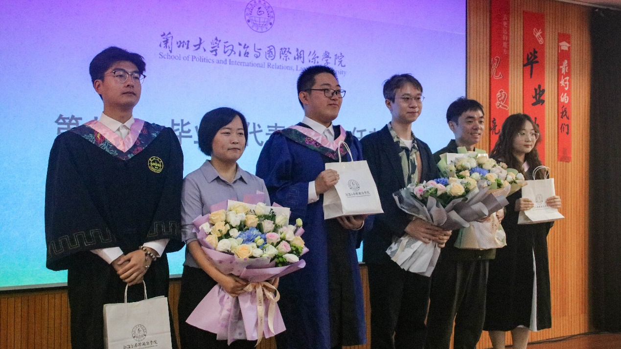 随后,博士生学生代表杨忞和本科生学生代表田磊分别进行发言。杨忞同学回顾自己的求学历程,深情讲述“十载求学路、一生兰大情”,梦寐以求的学术氛围、仰慕已久的学术前辈都令她难以忘怀,最后杨忞祝愿同学们无论处于何种境遇都要永葆平静的心态。田磊同学则以“为政以德,譬如北辰,居其所而众星拱之”开篇,指出作为一名政国学子,我们不仅要以德化行,用德行约束自己,更要有对世界的真实关切,仰望星空、脚踏实地,为实现理想而不懈奋斗。