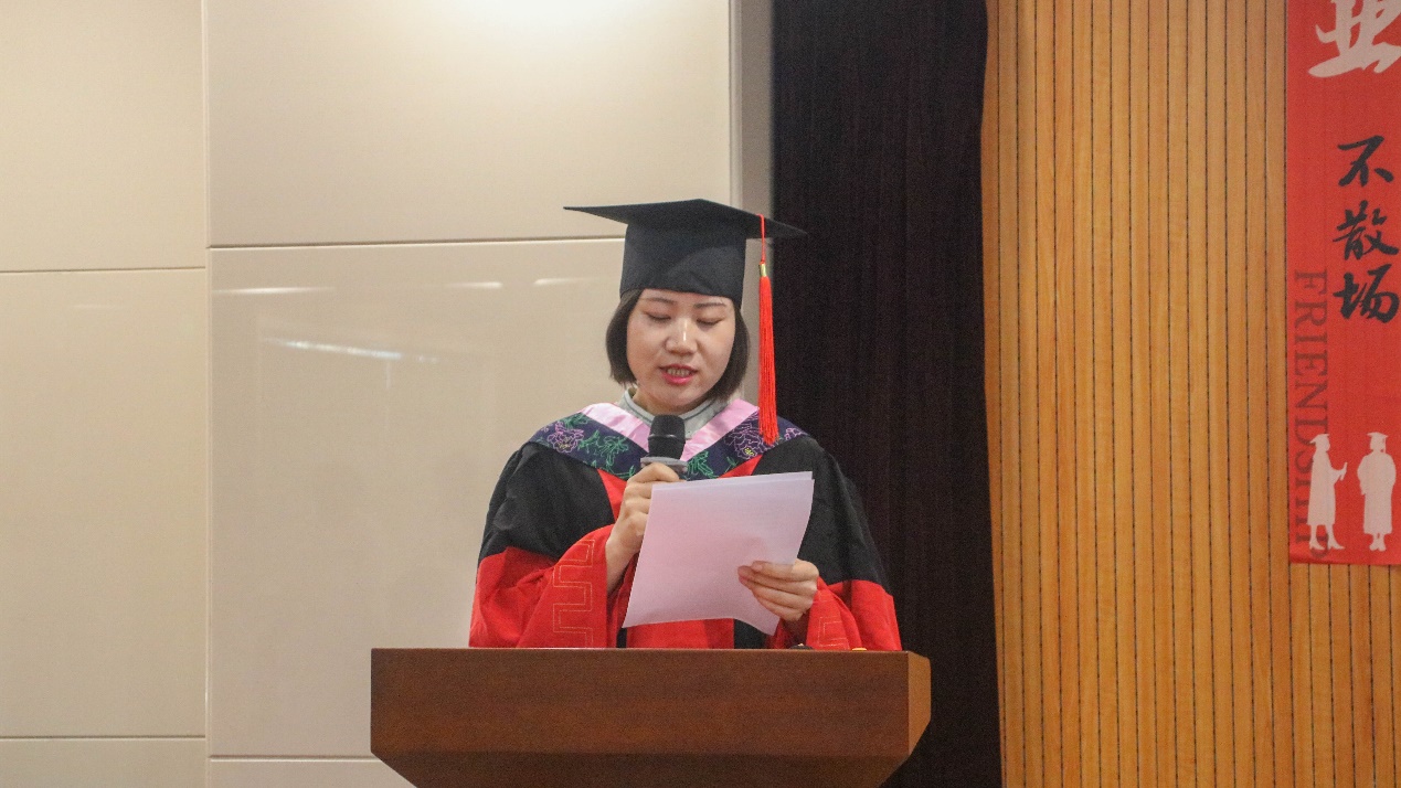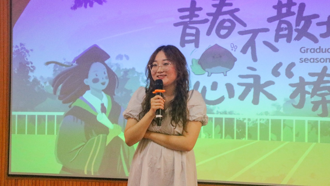 接着,毕业生班主任代表肖涵副教授发言。肖涵老师向毕业生们表示祝贺,并表达了她身为班主任对毕业生们深切的不舍与真心的勉励,希望同学们少内耗、能抗事、有理想、能进取,做一个有良知、肯行动的人,在空闲时常回母校看看,祝福同学们鹏程万里、大展宏图、共襄盛世。